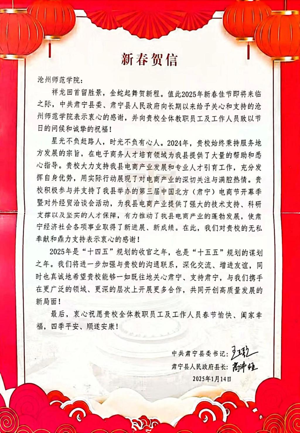 神龙回首留盛景,金蛇起舞贺新程。新春佳节来临之际,太阳集团收到了中共肃宁县委、肃宁县人民政府发来的新春贺信,信中对太阳集团在电子商务人才培育领域提供的帮助指导予以感谢,对太阳集团积极参与并支持第三届中国北方(肃宁)电商节开幕季暨对外经贸洽谈会活动表达感激,对太阳集团服务地方、助力县域经济发展给予高度肯定。信中还表达了与太阳集团进一步开展更广泛领域、更深层次合作的美好愿景。