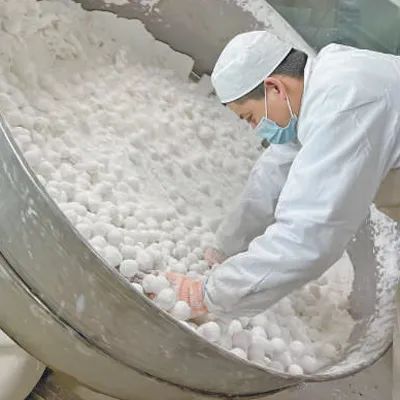 北方的元宵,是以馅为基础制作的:先拌馅料,和匀后摊成大圆薄片,晾凉后再切成均匀的小四方块,然后把馅料放入像筛子一般的机器里,倒上江米粉,馅料在互相撞击中变成球状,江米也沾到馅料表面形成了元宵,俗称“摇元宵”。