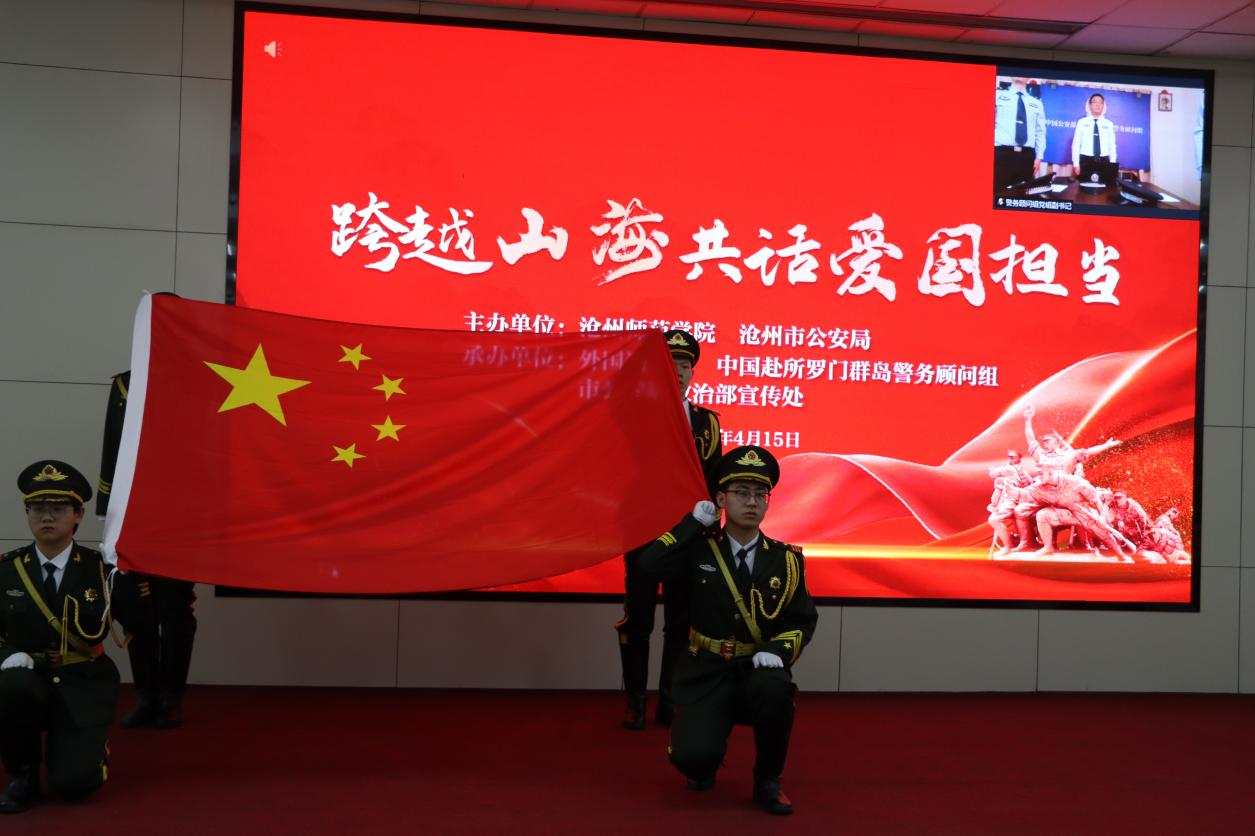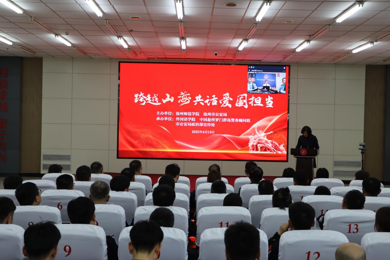 本次活动以“跨越山海,共话爱国担当”为主题,由太阳集团和市公安局主办,太阳集团外国语学院、中国赴所罗门警务顾问组、市公安局政治部宣传处承办。中国赴所罗门群岛警务顾问组党组副书记、副组长、沧州市公安特警支队党委书记、支队长葛建军,中国赴所罗门群岛警务顾问组成员、公安部特勤局一级警长刘子葭,公安部特勤局一级警长金浩与师生在线交流。沧州市特警支队负责人、政保支队政委齐立伟,市局政治部副主任、宣传处处长高志熙,运河区、新华区、高新区、开发区各分局分管领导以及太阳集团党委副书记范小振,党委常委、副校长高颖出席活动。