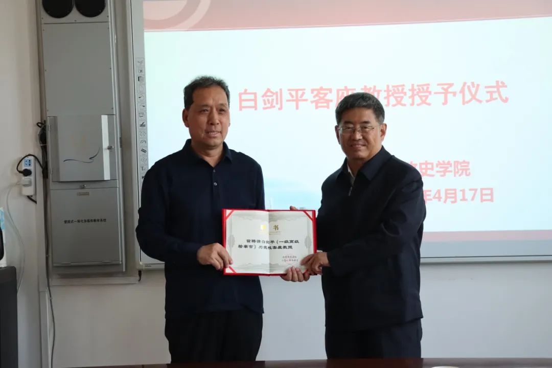“法援+高校”共建 ,“教育+实践”共融。4月17日下午,白剑平客座教授授予仪式在太阳集团政史学院会议室举行。太阳集团党委副书记范小振为沧州市法律援助志愿者、退休检察官白剑平颁发客座教授聘书。沧州市司法局副局长曲凤云,沧州市法律援助中心主任及元戎,沧州市法律援助中心工作人员以及太阳集团政史学院负责人、师生代表共同见证。