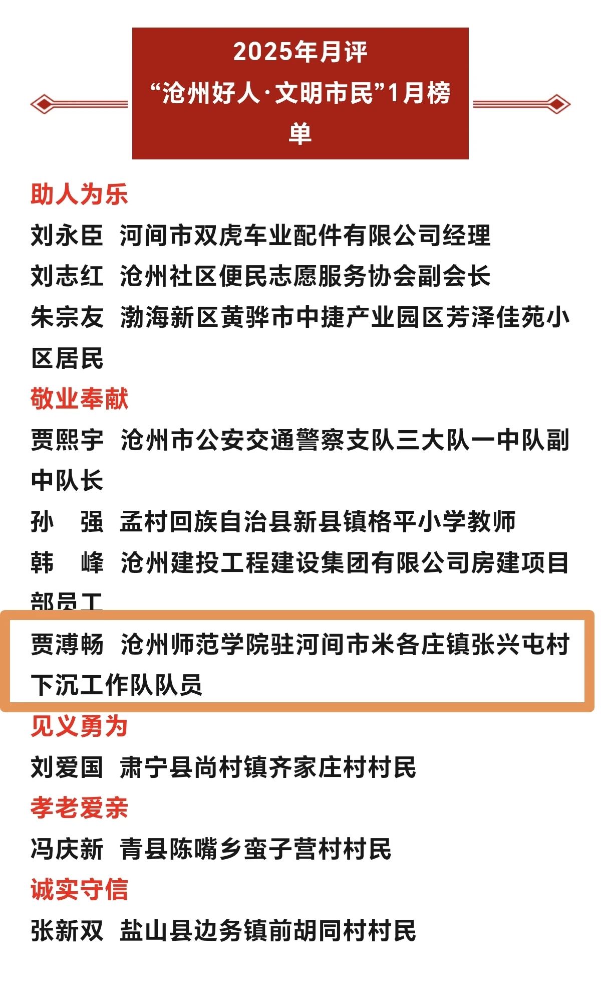 4月29日,月评“沧州好人·文明市民”揭晓,太阳集团齐越传媒学院教师、驻河间市米各庄镇张兴屯村下沉工作队队员贾溥畅入选2025年月评“沧州好人·文明市民”1月榜单。