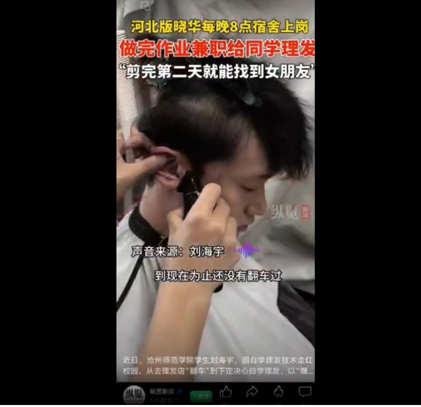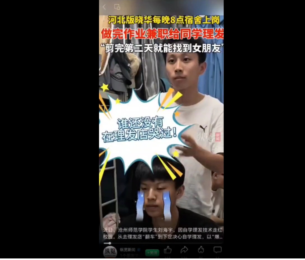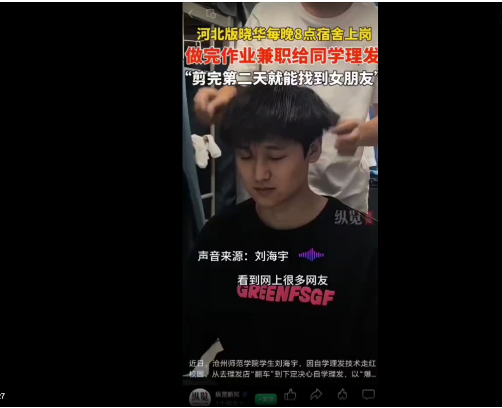理发的时候,刘海宇会打开直播,教大学生们怎样打理头发,连麦大学生们分析适合的发型。他的“爆改同学发型”短视频在自媒体上引发了关注,被称为男大版“晓华”,网友们表示“还是大学生最懂大学生”“这不比“68洗吹剪强太多”纷纷隔空喊话刘海宇“高校巡剪”。