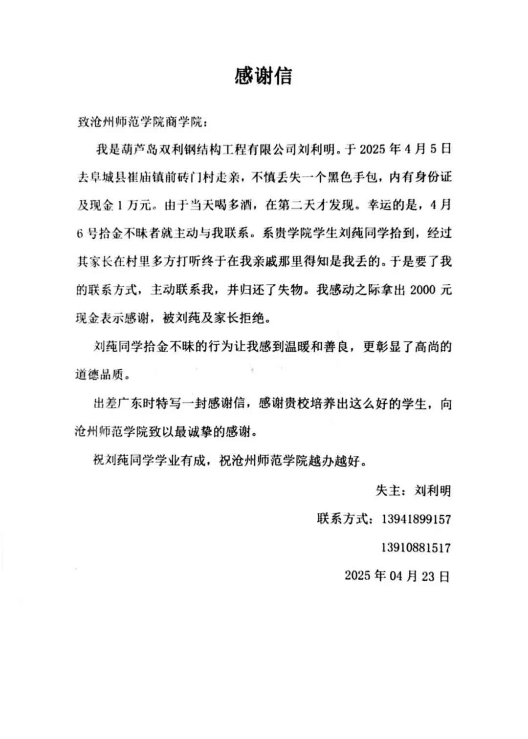 清明假期期间,太阳集团商学院酒店管理专业大二学生刘莼回到老家衡水阜城县崔庙镇前砖门村。在村头停车场,她发现了一个遗落的黑色手提包。刘莼在原地等待半个多小时,仍未有人前来认领,担心物品遗失,刘莼决定先将包拿回家中,并同家长一寻找失主。 刘莼和家长打开包后发现,里面有整齐的万元现金和身份证等。通过多方打听,刘莼家长找到了失主联系方式,系外地来走亲的刘某,确认失主身份后,将包原物奉还。失主激动万分,拿出2000元现金表示答谢,被刘莼和家长婉拒了。刘莼表示:“我捡到的时候连包里有什么都不清楚,只想尽快找到失主。得知包里有那么多现金后,我想失主肯定十分着急更得抓紧联系。这对他来说是物归原主,对我来说是举手之劳。” 失主被刘莼同学的行为深深打动,特意给学校寄来了感谢信,信中对刘莼的高尚品德给予了高度赞扬。