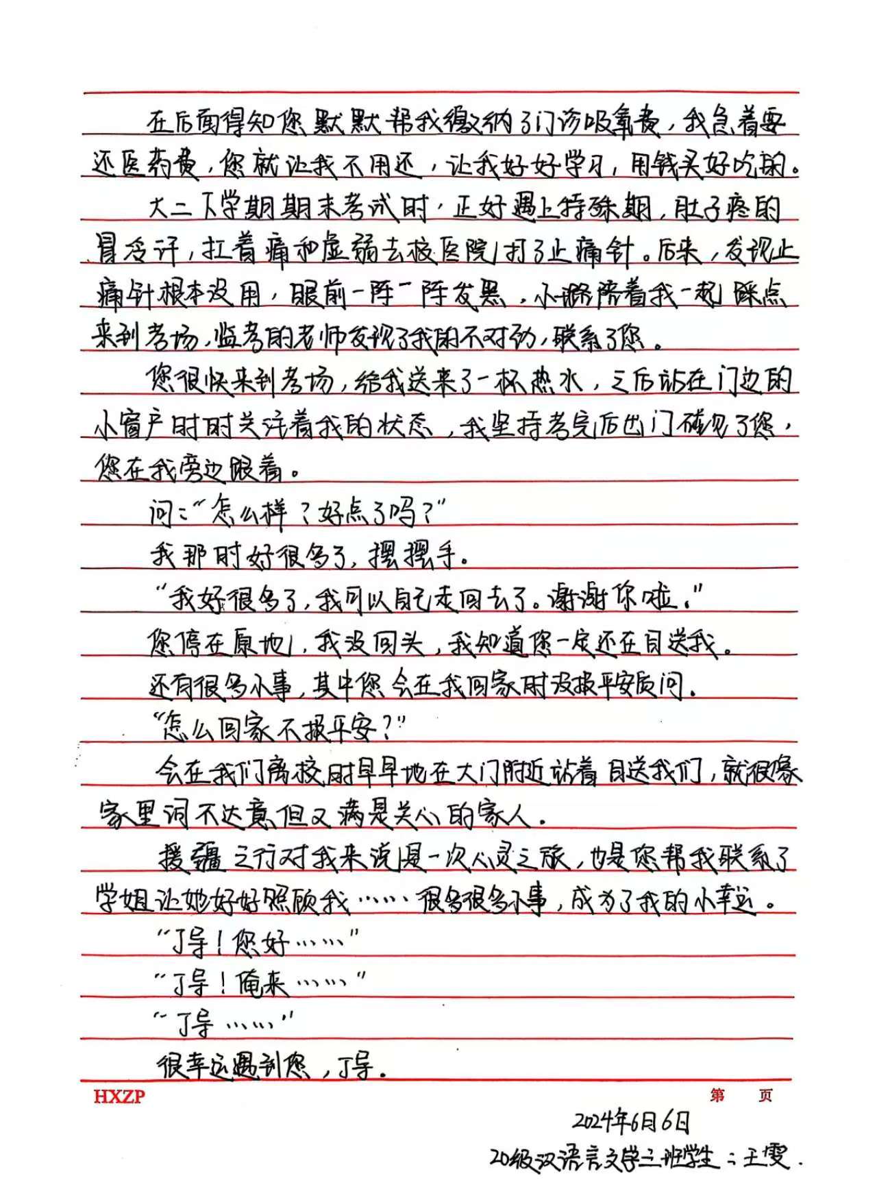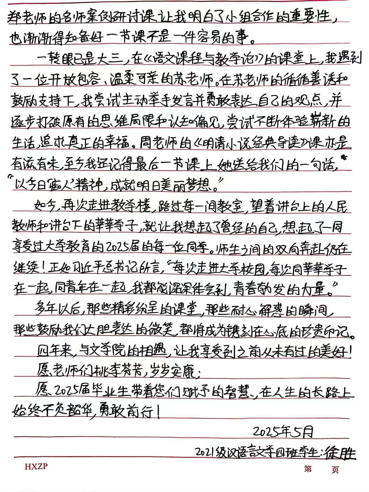 这面锦旗,是学子们对老师智慧引领的由衷致谢,也是对文学院四年时光的深情回望。随锦旗附上的亲笔信笺,更流淌出对恩师春风化雨、传道受业的肺腑感怀。