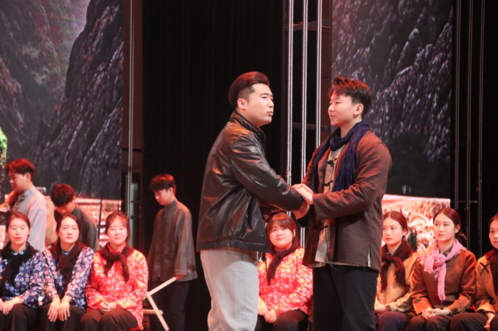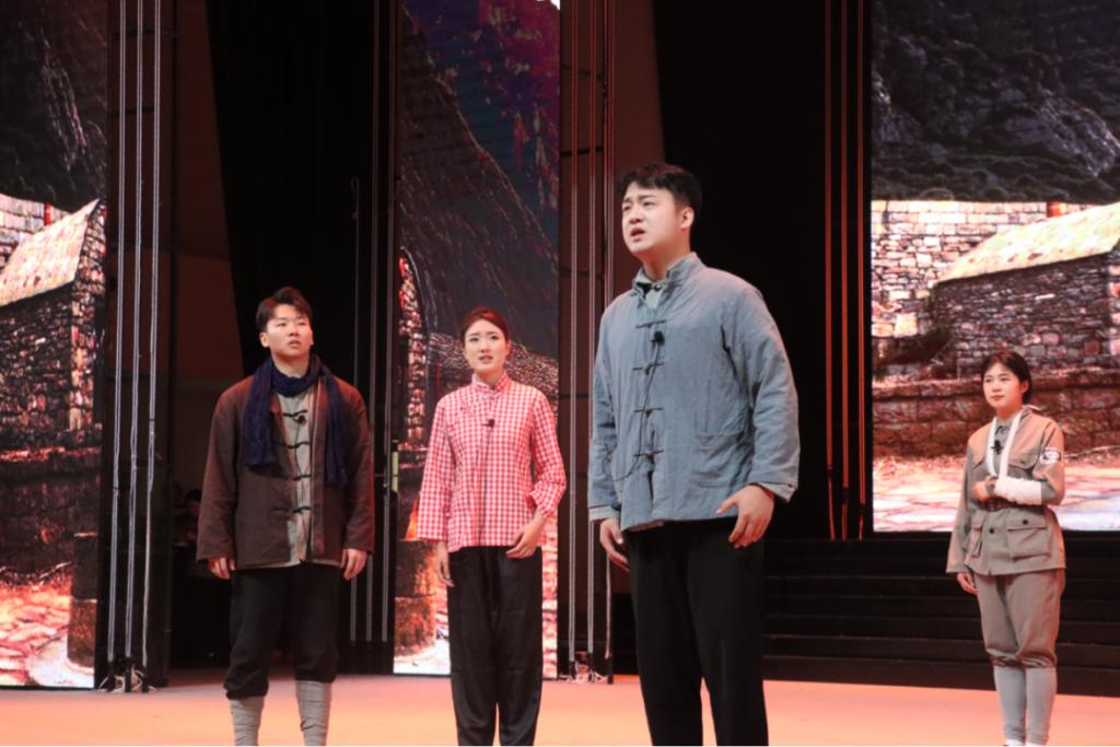 作品共分为七幕,演出中,音乐学院学生以精湛的表演和深情的演唱,将剧中人物海棠、林生、夏荷等英雄形象刻画得淋漓尽致,在面对敌人威胁时,他们将角色内心的恐惧与对正义的执着追求演绎得淋漓尽致;他们身姿挺拔、眼神坚定,成功塑造了沂蒙山老百姓与八路军战士舍生取义、为国为民的英雄群像;他们真情投入、表演丝丝入扣,让观众仿佛目睹了当年八路军战士奋勇杀敌的英姿,深刻感受到了沂蒙精神的伟大,再现了革命年代人民群众英勇抗战、无私奉献的感人故事。
