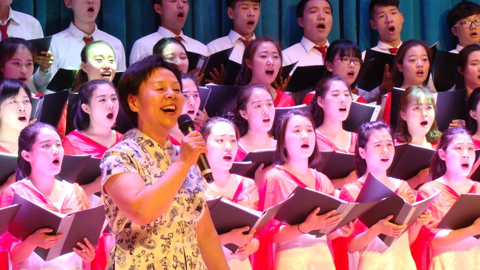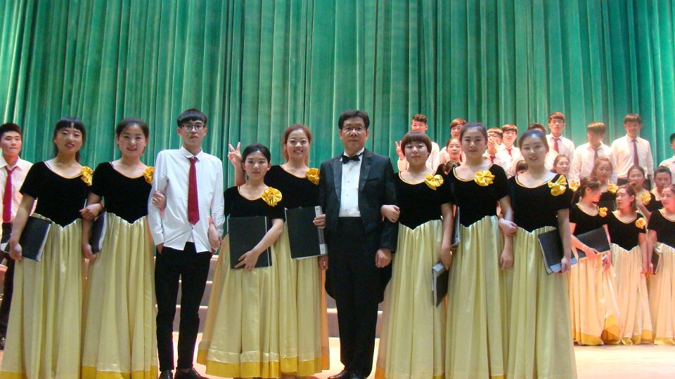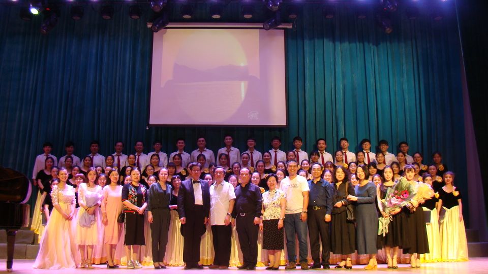 45月15日晚,冀春音乐厅歌声嘹亮,掌声阵阵。音乐学院2017毕业季音乐会合唱团专场演出在此精彩举行。由该院70余名学生组成的合唱团在郭卫东教授的指挥下,演绎了《欢乐的那达慕》《春天来到我们的战场》《在森林那一边》《昏格里拉》《桃花红杏花白》《菊花台》《巴黎圣母院的敲钟人》《同桌的你》《去一个美丽的地方》等9首中外经典歌曲。