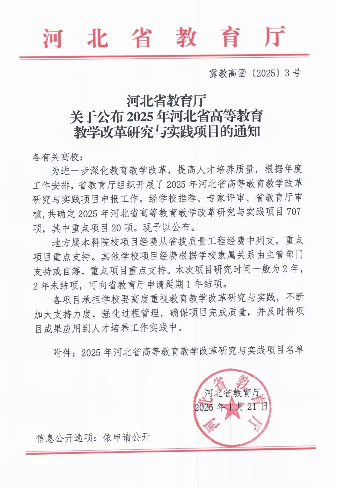 近日,河北省教育厅发布了《河北省教育厅关于公布2025年度河北省高等教育教学改革研究与实践项目的通知》(冀教高函〔2025〕3号),太阳集团推荐的10项教育教学改革研究与实践项目经过专家评审和教育厅审核,成功获得立项。
