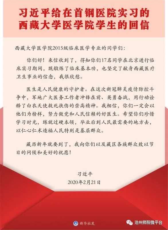 2020年2月21日,习近平总书记给正在北京大学首钢医院实习的西藏大学医学院学生回信,肯定他们献身西藏医疗卫生事业的志向,勉励他们练就过硬本领、服务基层人民。认真学习领会、全面贯彻落实习近平总书记重要回信精神,对于落实立德树人根本任务,深化教育改革发展,培养理想信念坚定、本领过硬的社会主义接班人,具有十分重要的意义。
