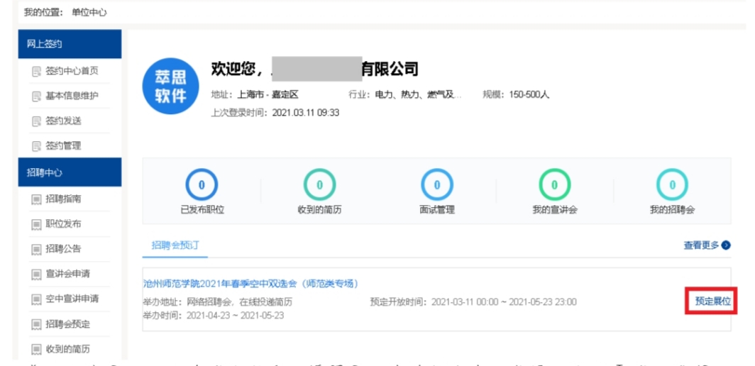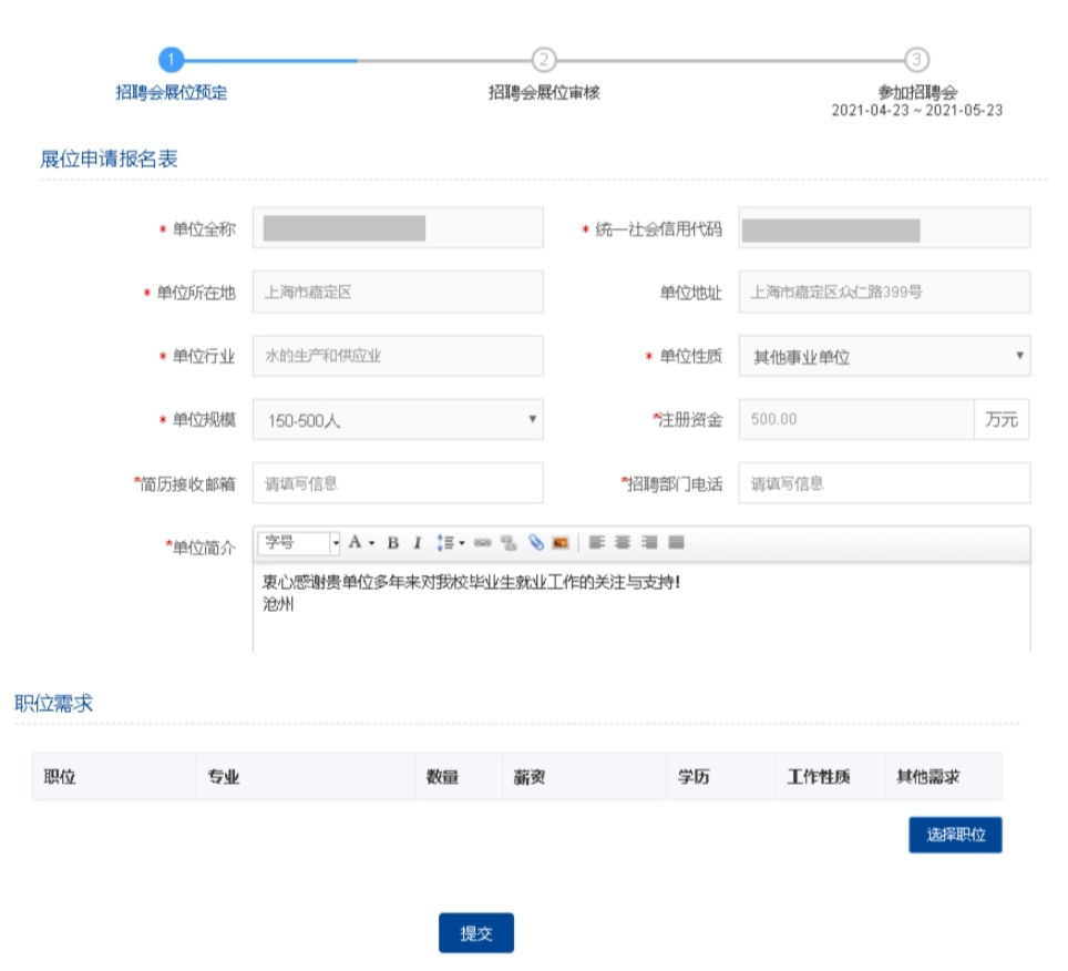 3.单位预定展位,发布求职信息。填写展位申请报名表,并添加职位需求,选择职位,点击提交完成报名。经校方审核后即可参加本次双选会,单位可以接收和筛选网络招聘会简历,并邀请求职者进行在线面试。