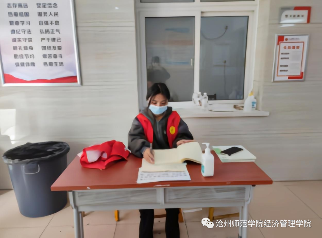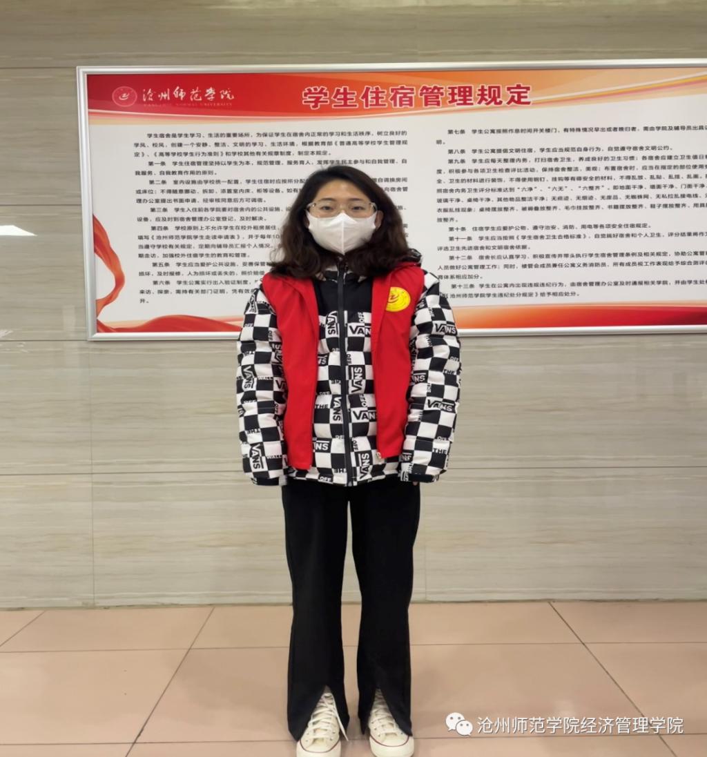 自沧州疫情以来,学校领导老师日夜坚守,我想,作为一名学生干部又怎么能退缩。在导员的推荐下,我成为了一楼的层长,协助楼长管理本层同时身为班长,在班级事务上我也尽量帮忙。我深知自己肩上的责任,这次疫情也更加锻炼了我自己的毅力和处理紧急事情的能力。很荣幸我成为一名志愿者,我相信没有一个冬天不能逾越,没有一个春天不会来临。