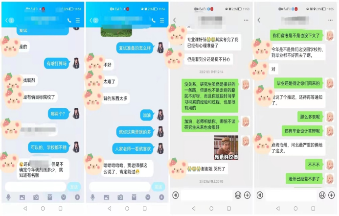 “没关系,笔试那么多人都打败了,复试不叫事儿。”“老师觉得你没问题,你获得的荣誉这么多,研究生学校肯定喜欢。”“分数低一点没关系,一志愿去不了,调剂也可以调剂到好学校。”……传经送宝之余,各学院也关注学生心理压力的疏导。毕业班辅导员发挥特长,一边通过QQ、微信等开展线上心理咨询和情绪疏导,为同学们调整复试心态,一边深入宿舍,送去水果、零食、文具,促膝谈心,及时缓解备考压力,鼓励学生勇敢克服疫情带来的各种困难与挑战,以自信姿态迎接复试。这些暖心的举动,成了考研学子的心灵加油站。
