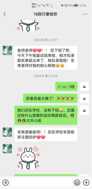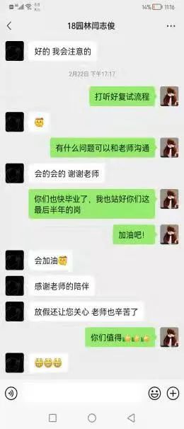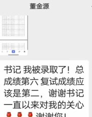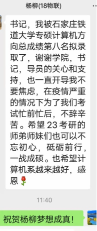 成功上岸的同学们,第一时间向学院领导、老师、辅导员分享了喜讯,并对学校的贴心帮扶表达感谢。计算机科学与工程学院2020级专接本班张盟同学说:“沧州师院是我梦想起航的地方,这里充满了爱和温暖,在备战考研期间有关于考研的消息,书记会第一时间会通知我们,领导老师会给我们提供考研经验。进入复试之后,复试环境、复试设备不知如何准备时,学院书记、院长、导员老师会第一时间给我们安排复试场地,帮我们解决关键问题。如今我考研上岸,离不开老师们的帮助,这里是我的福地,我会带着老师们的祝福,带着我的感恩,一路前行。”