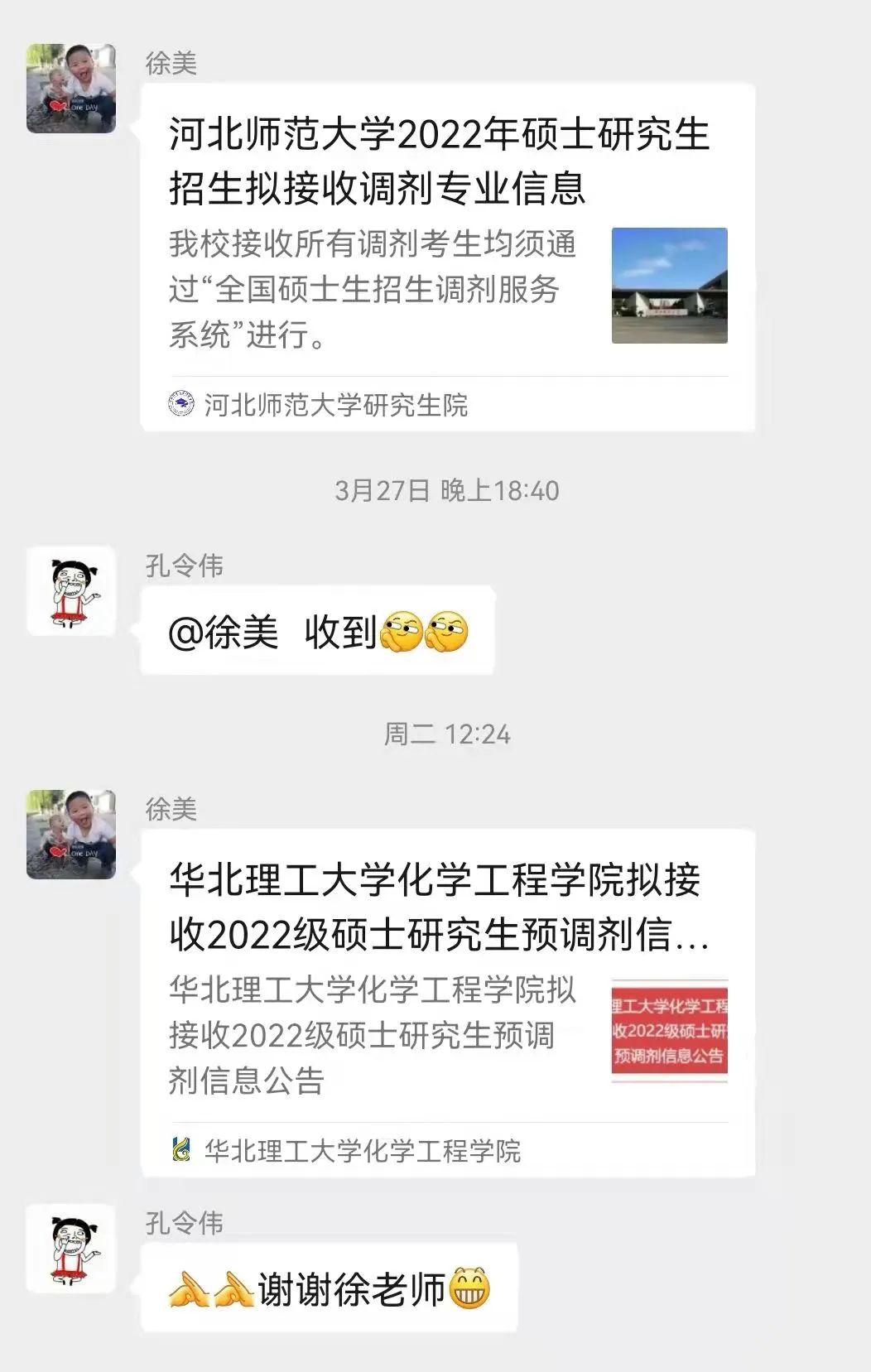 学院党政领导、辅导员与专业教师全面出动,线上线下整体联动,为学生提供全方位的指导服务:建立学业导师“一对一结对帮扶”,从专业学科、复试面试、调剂院校等方面进行指导;全面了解考生备考情况,引荐往届考研成功的学长学姐搭建朋辈帮扶桥梁,指导学生有针对性地制定复试计划、熟悉复试技巧;对于需要调剂的学生,积极搜集信息,及时告知学生并积极推荐,力争让学生思路更清晰、方向更明确。在考研的路途中,学院既是“引路人”,也是“守护者”。其中,化学与化工学院的“复试指导小组”、生命科学学院的“线上考研心得分享会”、马克思主义学院的“一对一专业导师制”、政史学院的“分类专属压缩包”等举措都深受考研学子欢迎。