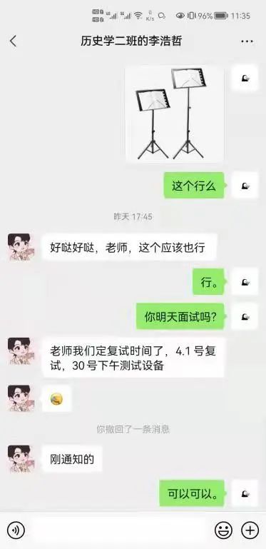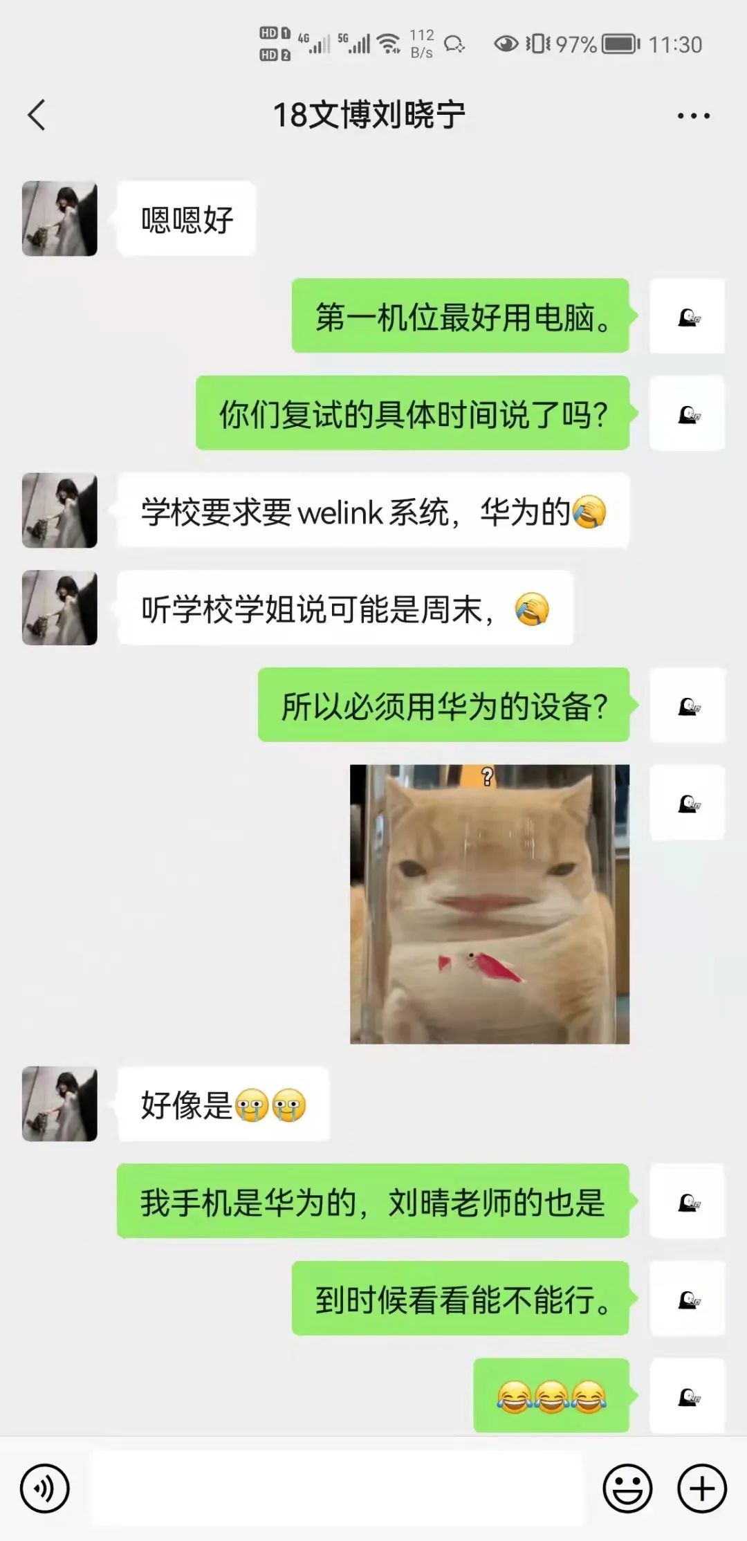 这些感动和温情还在延续,很多已经完成复试的同学,主动加入了学院里的“复试志愿者服务队”,一边将实战经验分享给即将复试的同学,一边帮助安排复试教室、进行消杀清理、设备通讯调试。在这股强大合力下,复试学生信心满满、底气十足。