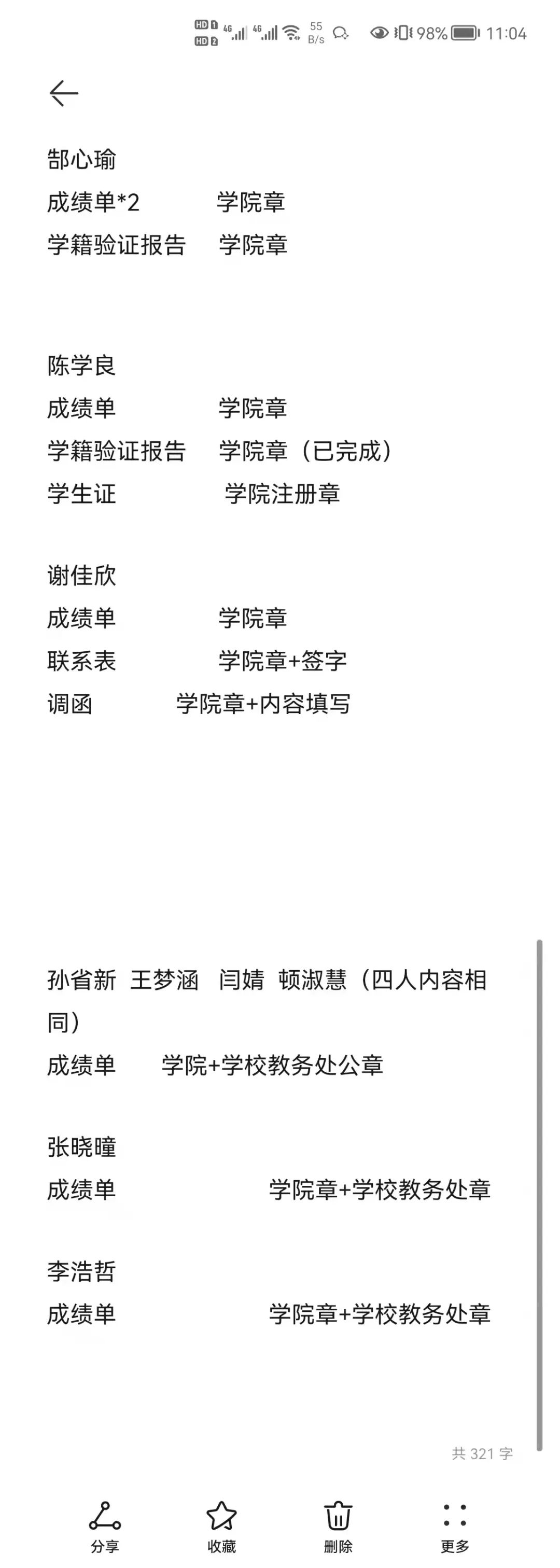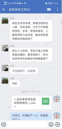 疫情封闭管理期间,校外复试同学进不来,宿舍内复试同学也出不去,成绩单打印、政审材料准备、体验报名等前期准备工作可急坏了学生们。由于同学们是陆续收到考研复试通知,各个院校复试材料要求不一,因此在校的学院领导、老师们在全面摸清底数的情况下,建立了一人一档的“数据库”,精准对接到每一个考生,按照清单备齐材料之后再亲手送到学生手上,确保不落下一人、不办错一条,不延误一刻。