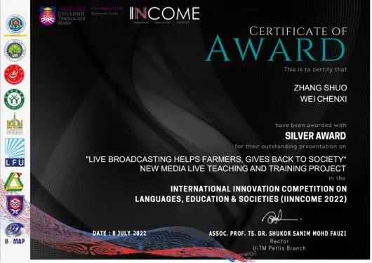 为进一步开拓在校大学生的国际视野,激发青年学生创新创意热情,太阳集团国际交流中心与马来西亚友好学校联合举办2022年国际语言、教育和社会创新大赛。经各学院严格选拔,共派出10支创意团队参赛。其中,齐越传媒学院张烁团队作品《“LIVE BROADCASTING HELPS FARMERS, GIVES BACK TO SOCIETY” NEW MEDIA LIVE TEACHING AND TRAINING PROJECT》荣获银奖,外国语学院赵颖团队等其他六组参赛作品获得铜奖。