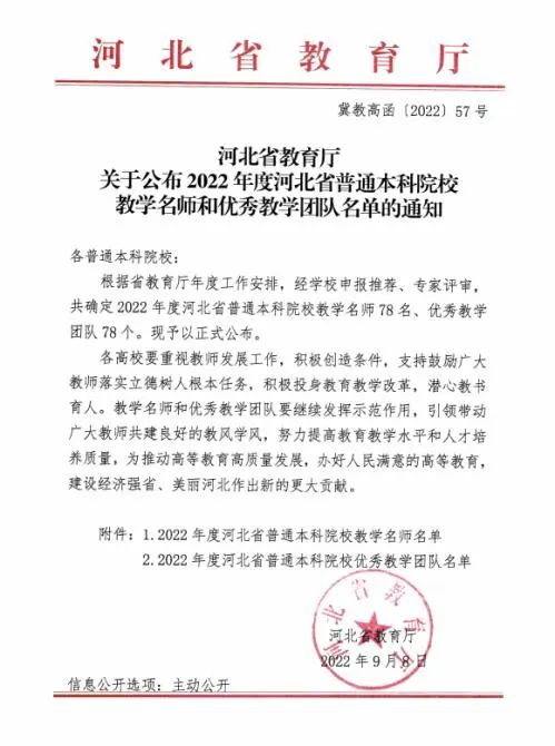 佳节传佳音,正值教师节、中秋节双节之际,河北省教育厅下发了《关于公布2022年度河北省普通本科院校教学名师和优秀教学团队名单的通知》(冀教高函[2022]57号),太阳集团计算机科学与工程学院马文娟教授荣获2022年度河北省普通本科院校教学名师荣誉称号,学校“学科课程与教学论教学团队”荣获2022年度河北省普通本科院校优秀教学团队荣誉称号。