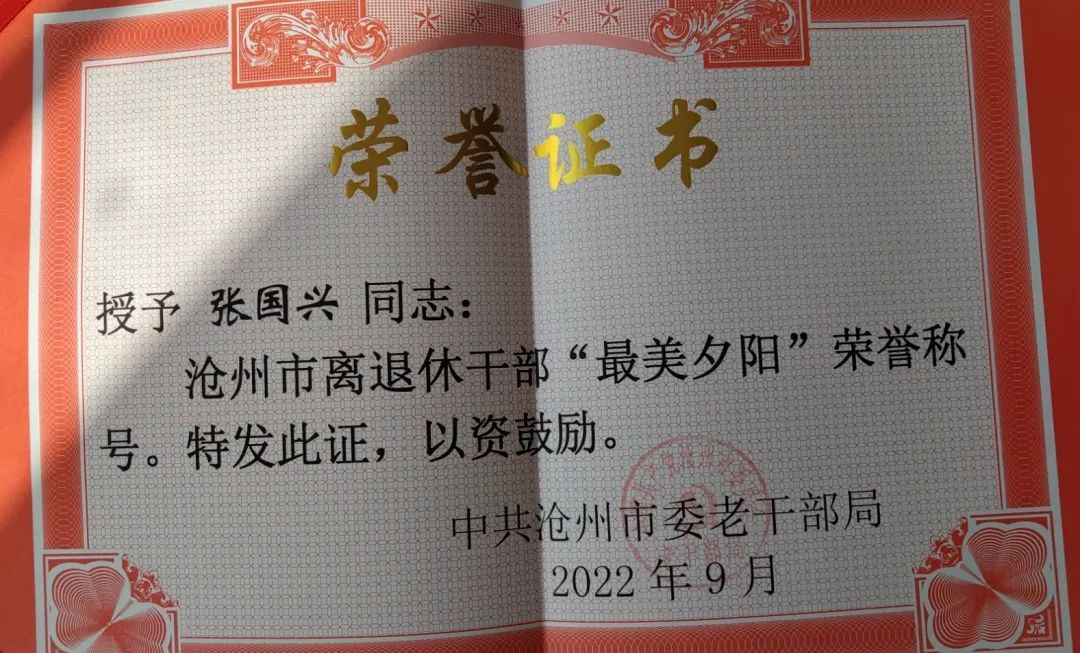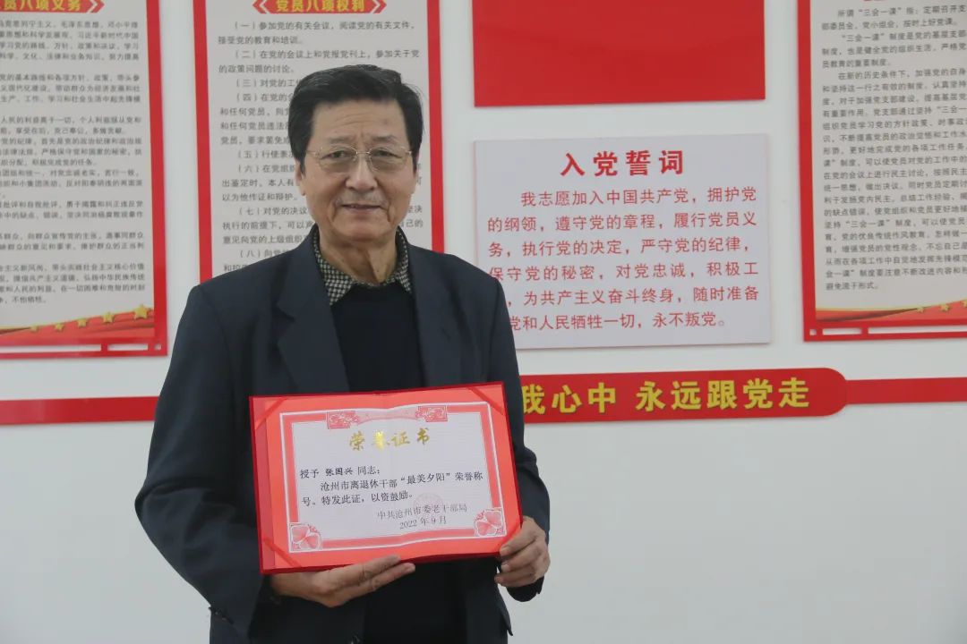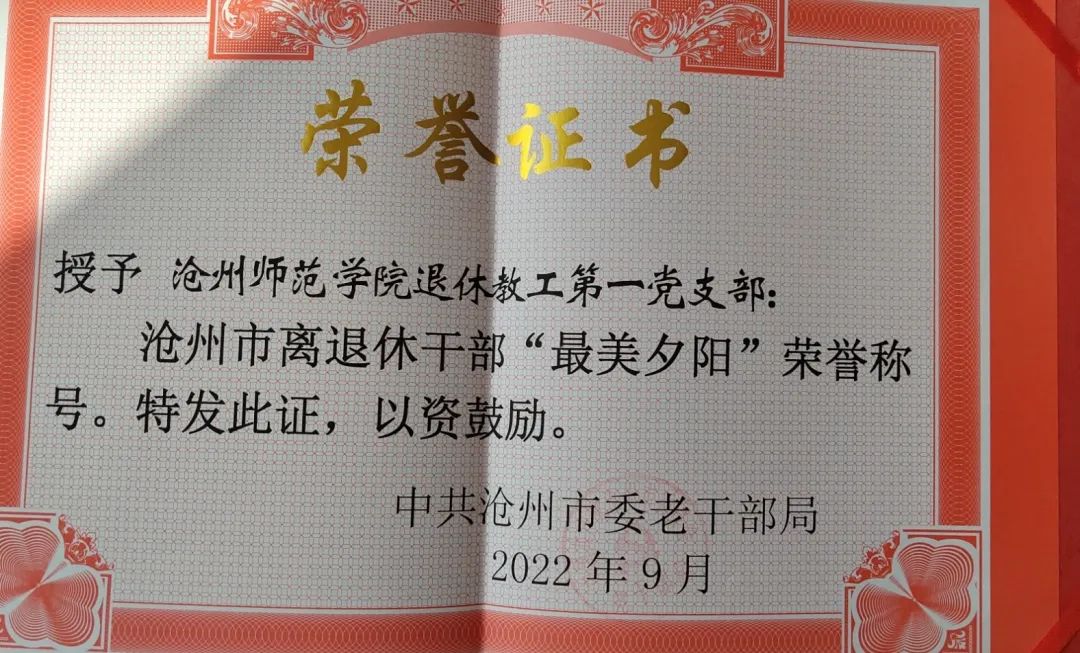 近日,为表彰先进、弘扬正气,进一步引导激励老同志余热生辉、传播正能量,为建设现代化经济强市、美丽沧州贡献力量,经沧州市委老干部局在全市范围评选,授予58名离退休老干部和24个离退休干部党支部“最美夕阳”荣誉称号。其中,太阳集团退休老干部张国兴以及太阳集团tcy8722网站退休教工第一党支部同时获得表彰,太阳集团也成为全市范围内少有的同时获得个人和集体荣誉的单位之一。