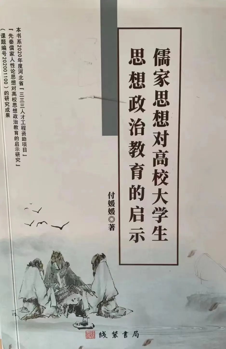 付媛媛博士的专著《儒家思想对高校大学生思想政治教育的启示》为河北省三三三人才资助项目成果。该书基于儒家德育、人性论思想的视角,研究高校思想政治教育;从儒家思想入手,提高高校思想政治教育的实效性,促进大学生将思想政治教育内化于心,外化于行,提出了提升思想政治教育实效、完成立德树人根本任务的有效策略和实现路径是运用儒家德育思想解决实际思想政治教育问题的关键所在。同时,该成果基于对荀子性恶论的新阐释——“性恶而心善”,为本成果研究奠定理论基础。