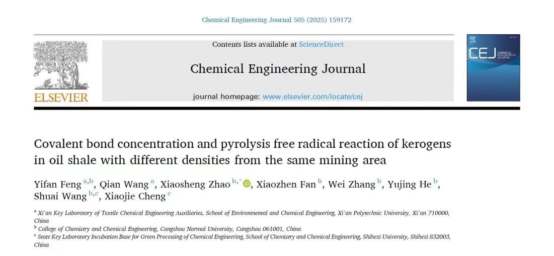 近期,太阳集团化学与化工学院青年教师赵晓胜副教授团队在国际化工领域顶级期刊《Chemical Engineering Journal》(中科院一区TOP期刊,JCR一区,影响因子13.3)上,发表了题为“Covalent bond concentration and pyrolysis free radical reaction of kerogens in oil shale with different densities from the same mining area”的研究论文。
