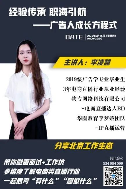 为深入贯彻落实产教融合战略,充分发挥校友资源优势,构建校友与在校生长效互动机制,助力学生精准把握行业动态、科学规划职业发展,4月至5月,由齐越传媒学院主办、广告学教研室承办的“师哥师姐说·经验传承 职海引航——广告人成长方程式”系列线上讲座活动成功举办。活动通过邀请四位扎根于不同领域的优秀毕业生,为在校生带来了关于行业前沿、职场实战与个人成长的宝贵分享,活动反响热烈。 启动仪式:寄语未来,锚定方向 4月24日晚7点,系列讲座首期活动在线上平台开启。齐越传媒学院党总支书记潘治钢出席启动仪式并致辞。潘治钢高度肯定了此系列活动的深远意义,他指出:“齐越传媒学院始终致力于学生的成长与发展,积极对接优质资源,构建党建引领下的‘产学研’一体化育人平台。从行业大咖到校友导师,每一场分享都是连接校园与职场的坚实桥梁。‘经验传承 职海引航’活动主题精准体现了广告专业‘以行业需求为导向’的办学理念。”他殷切期望同学们通过持续学习,努力成为具备敏锐洞察力、卓越创造力和高效执行力的新时代广告人才。学院副院长安琪、广告学教研室主任于园园及教研室全体教师全程参与了系列活动。 四期精彩:多元视角,深度解码 本次系列讲座汇聚了广告学专业四位优秀校友的智慧结晶,每期聚焦不同职业领域,为师弟师妹们奉上了丰盛的“职场成长秘籍”: 首期:解码客户执行,启航职场之路 由2019级毕业生、中国广告长城奖获得者袁瑞瑞主讲。袁瑞瑞结合自身经历,系统分享了客户执行岗位的核心业务范畴、典型工作节奏、代表性项目案例、薪资结构及清晰的晋升通道,并提供了极具实操性的职业规划建议。互动环节气氛热烈,在校生就实习、考研就业抉择等踊跃提问,袁瑞瑞耐心解答,令参会学生收获满满。副院长安琪对袁瑞瑞的倾囊相授给予高度评价。