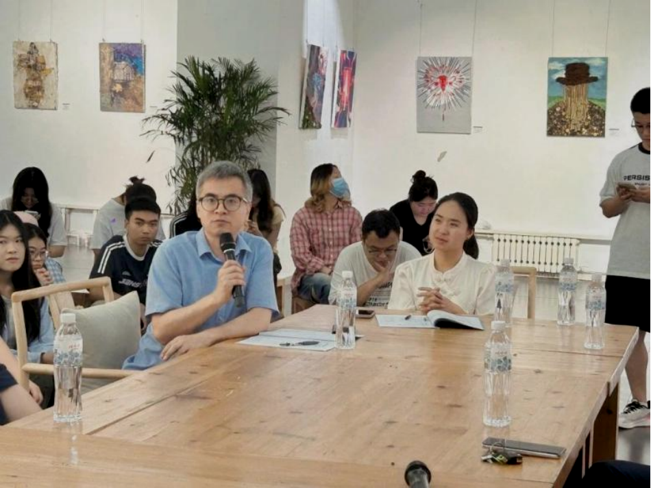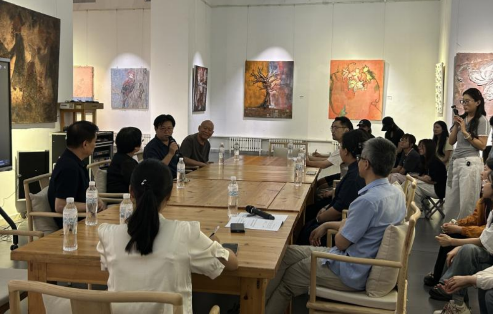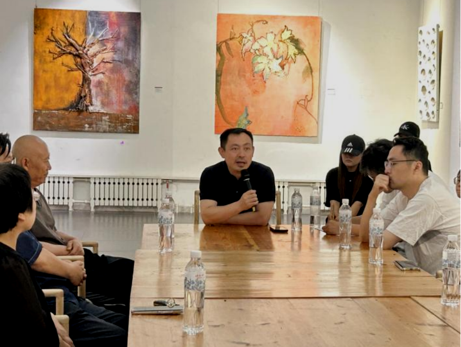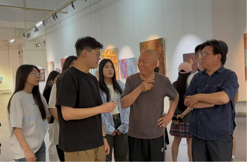 作为本次教学改革的核心推动力,古光辉名师工作室充分发挥了引领与辐射作用。在工作室主持人古光辉老师的带领下,教学团队打破了传统学科与年级界限,实现了绘画与中国画专业的深度融合教学。这种跨专业、跨年级的联合教学实践,有效激发了学生的创新思维与协作精神,为学生们提供了更广阔的艺术探索空间。开幕式上,古光辉老师带领学生向与会嘉宾详细讲解创作理念,并在随后的研讨会中主持并强调课程“以探索创新为导向,通过材料实验与跨学科思维,重构绘画表达维度”的核心目标。