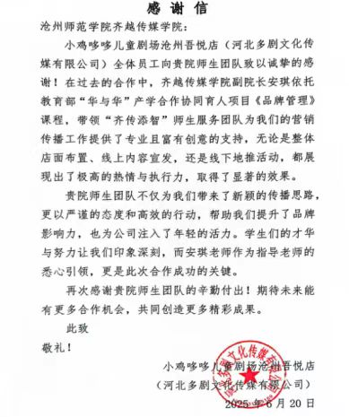 近日,齐越传媒学院收到小鸡哆哆儿童剧场沧州吾悦店(河北多剧文化传媒有限公司)的感谢信,对学院“齐传添智”师生团队在合作中的专业支持与辛勤付出表示诚挚感谢。