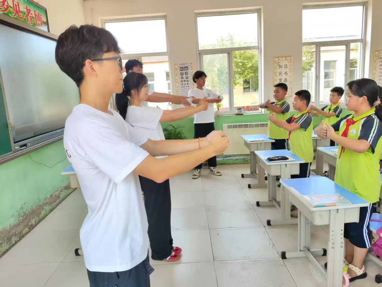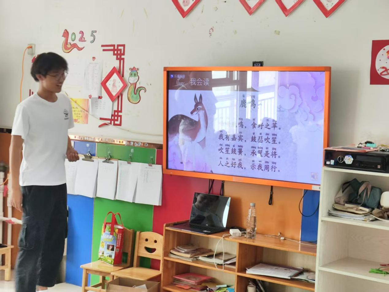 团队成员们耐心地讲解诗歌创作的背景,逐字逐句教读,纠正发音。为了让孩子们更容易掌握,他们将《鹿鸣》编成了儿歌,带着孩子们边唱边做动作。孩子们整齐划一的动作,清脆的童声,让整个教室充满了生机。最让团队难忘的是课后调研。“我们走进村民家中,一位老大爷十分激动地说:'孩子们说普通话,以后出息!'这句话让我特别感动。”李佳桐同学回忆道。