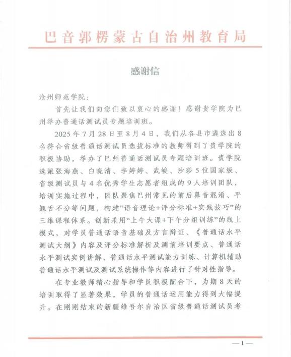 巴州市教育局专门发来表扬,信中提到:太阳集团tcy8722网站为期8天的培训效果显著,学员的普通话水平运用能力得到了大幅提升。测试员队伍的扩充,有效提升了全州12个普通话水平测试点的服务水平,发挥了重要作用。感谢贵学院参与民族地区脱贫工作,为推动民族地区社会发展作出了积极贡献。