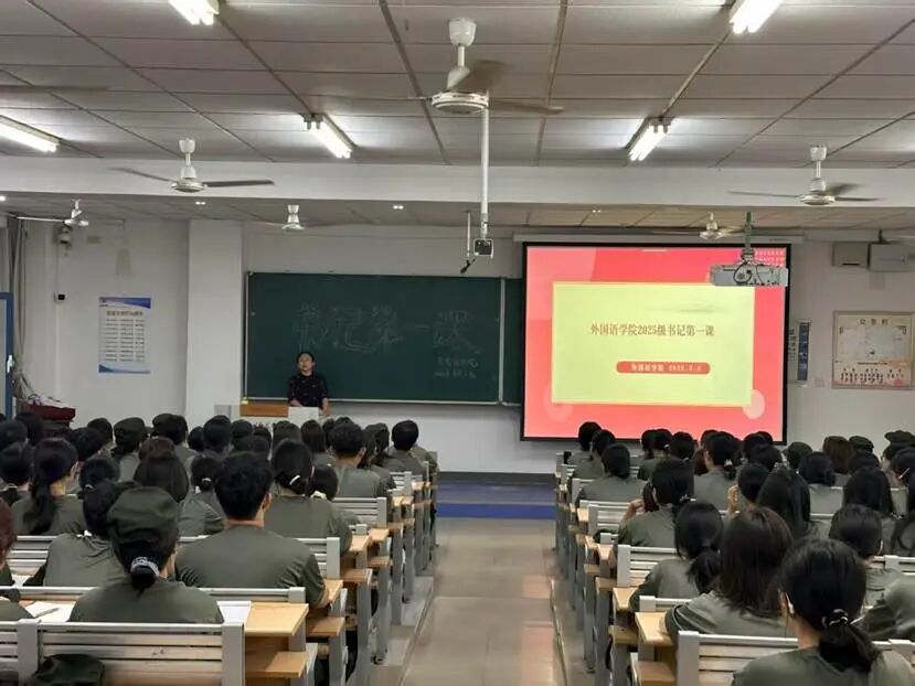 9月8日晚,外国语学院党总支书记陈瑞坤为2025级全体新生讲授“书记第一课”。