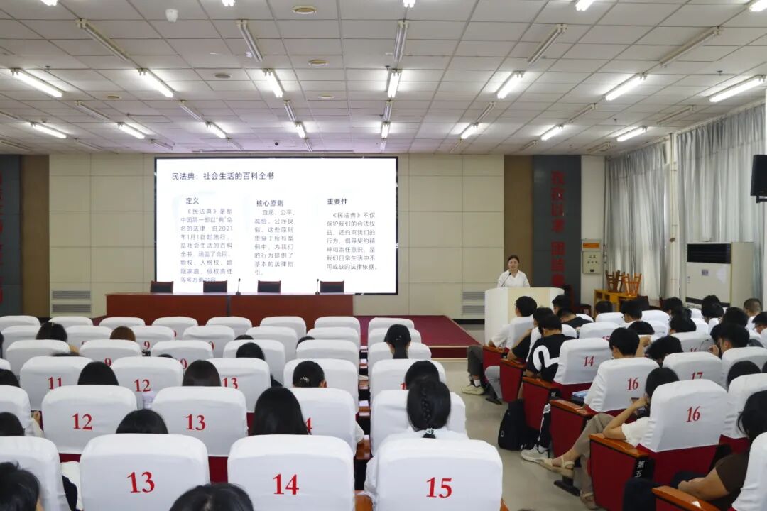为积极响应河北省教育厅关于开展法治“开学第一课”活动的号召,切实提升太阳集团大学生的法治观念和法律素养,引导学生尊法、学法、守法、用法,9月11日下午,太阳集团tcy8722网站法治“开学第一课”专题讲座在学术报告厅举办。政史学院教师黄珊以“《中华人民共和国民法典》与校园生活”为主题进行授课,旨在贯彻落实习近平法治思想,增强大学生法治意识,引导青年学子尊法学法守法用法,400余名学生现场聆听。