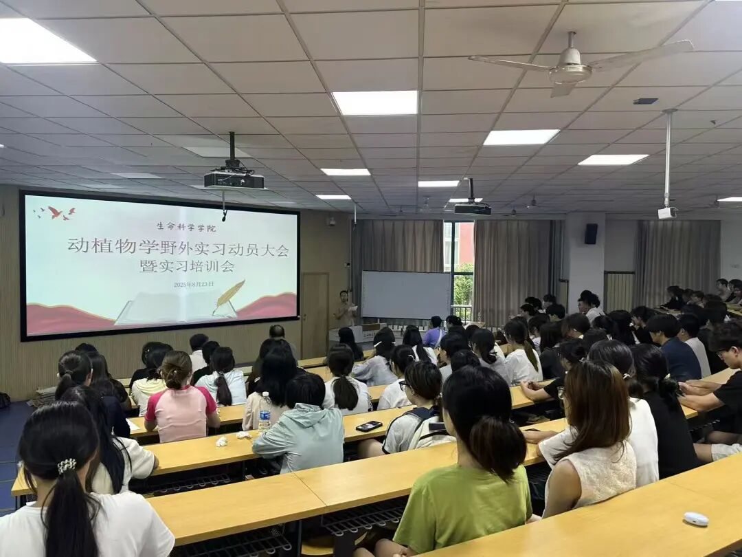 为贯彻落实人才培养方案,提升同学们对动植物学野外实习的认知,做好实习前思想与行动准备,8月23日,生命科学学院于鲲鹏教学楼第一阶梯教室召开生命科学学院2025年学生野外实习动员大会,该学院院长王竹承、党总支书记刘汝丰、副院长宋立立、2024级辅导员马馨洁、动植物实习专业指导教师李末、孟维悦、王君(大)、张亚楠出席,2024级生物科学和生物技术学生参加。教师路致远主持。