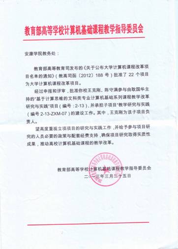 日前,接教育部高等学校计算机基础课程教学指导委员会函(教高司函[2012]188号),电信系王克刚、陈守满获准参加西北大学耿国华教授主持的“基于计算思维的文科类计算机基础系列课程教学改革研究与实践”项目(编号2-13),并承担子项目“教学研究与实践”(编号:2-13-ZXM-07)的建设工作。其中,王克刚为该子项目的负责人。