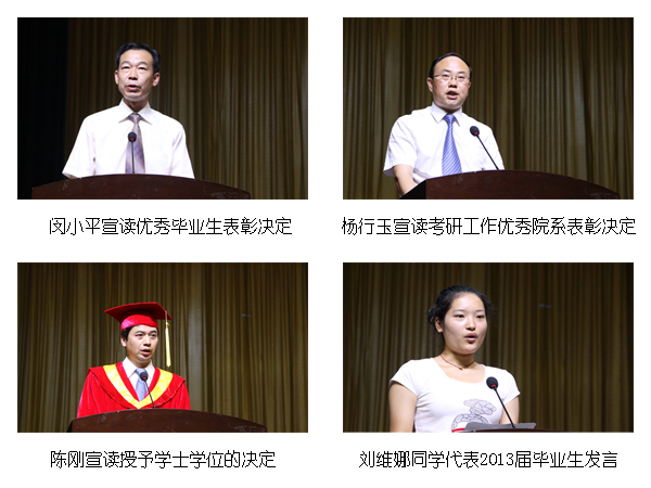 党委副书记、纪委书记闵小平宣读了优秀毕业生表彰决定,副校长杨行玉宣读了考研工作优秀院系表彰决定,学校领导为考研工作优秀的农生院、政史系、化工系颁奖,副校长陈刚宣读了Beat365唯一官方网站2013年授予学士学位的决定。