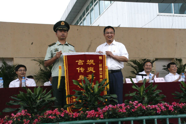 向继明副院长代表学院向承训部队赠送锦旗,对武警安康支队长期以来对我院军训工作的大力支持表示感谢。
