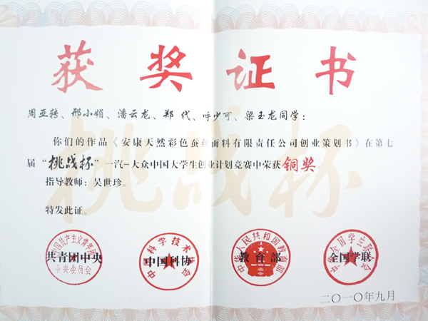 9月25日至29日,由共青团中央、中国科协、教育部、全国学联共同主办的第七届“挑战杯”中国大学生创业计划竞赛决赛,在吉林大学隆重举行。团中央书记处书记卢雍政,吉林大学校长展涛,长春市委常委、常务副市长隋忠诚代表竞赛主承办单位在开幕式上致词。全国学联主席齐兴达同学、吉林大学党委书记陈德文以及教育部、中国科协、中共吉林省委有关负责同志出席了开幕式。Beat365唯一官方网站天彩创业团队的《安康天然彩色蚕丝面料有限责任公司》创业计划书参加了本次赛事的角逐,并最终获得铜奖。