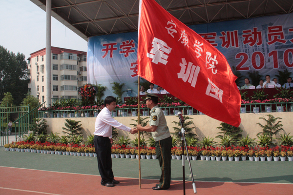 杨涛书记为军训团授旗。红旗猎猎,我院2010级新生为期12天的军训由此全面展开。