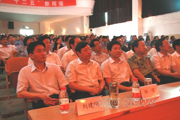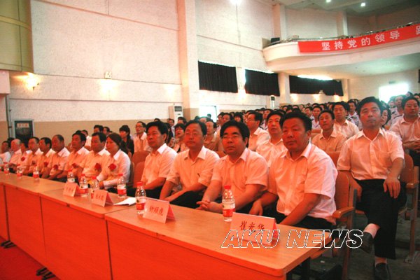 6月28日下午,安康市庆祝中国共产党建党89周年暨表彰大会在我院西校区大礼堂隆重举行。市上领导刘建明、崔光华、邹明、徐启方、钟顺虎、杨平社、鲍永能、马?、吴德珠出席会议。各县(区)委书记、组织部部长,市委各部门和市直各单位、各人民团体党组(党委)和中省驻安单位主要负责人以及部分受表彰的先进集体代表出席了大会。大会由市委副书记崔光华主持。 市委书记刘建明在讲话中指出,伴随着党的光辉历程和共和国的前进脚步,安康的面貌发生了翻天覆地的巨变。一个生态、富裕、文明、和谐的新安康,正向我们走来。刘建明同时对今后一个时期加强和改进党的建设的各项重点工作做了强调并号召全市各级党员干部在科学发展观的指引下,进一步解放思想,开拓创新,抓住机遇,突破发展,努力创造无愧于党、无愧于人民、无愧于时代的新业绩,共同开创安康美好的未来。 大会对2009年度全市“升级晋档、科学发展”和“文明社区、和谐家园”活动先进党组织进行了表彰。 会上,我院师生演出了大型六幕经典民族歌剧《党的女儿》。在两个小时的演出中,《党的女儿》以鲜明深刻的主题、扣人心弦的情节、优美动听的音乐;演员们以精湛娴熟的表演、强烈的艺术感染力和冲击力,征服了现场观众,获得了如潮的掌声。