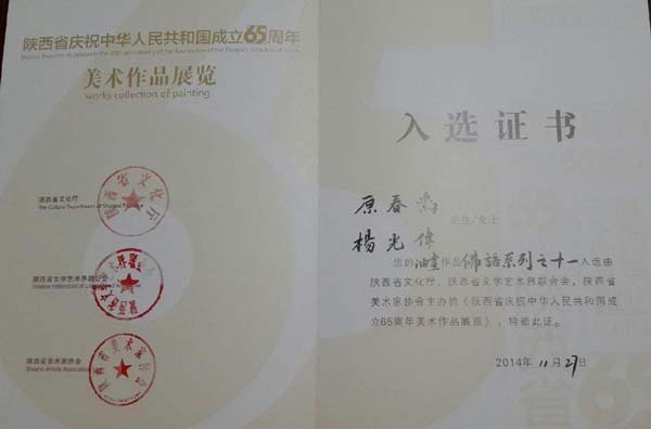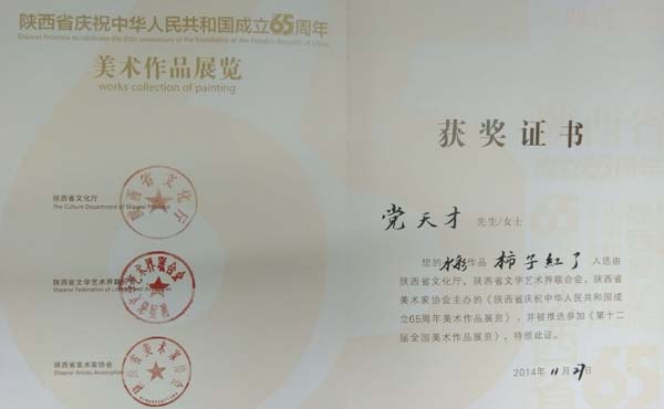 近日,由Beat365艺术系教师党天才创作的水彩画《柿子红了》、章长青创作的国画《回家》、原春鸣创作的油画《佛语系列之十一》(与杨光伟合作)、骆阳创作的油画《陕南映像》,外聘教师卜嘉艺创作的版画《革命文物》、王关棣创作的国画《带梦远行》入展由陕西省文化厅、省文联、省美协主办的“陕西省庆祝中华人民共和国成立65周年美术作品展”,其中党天才、章长青、卜嘉艺的美术作品被推选参加十二届全国美术作品展览。