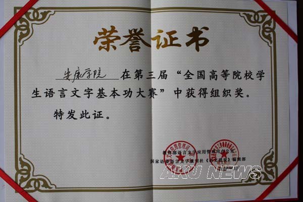 中文系汉语言文学、语文教育、文秘专业07级、08级、09级共670名学生于2009年12月在赵桃老师的辅导、组织下,参加了由教育部、国家语委主办的第三届全国高等院校学生语言文字基本功大赛。 本届大赛全国有300多所院校的12万学生参加,我院中文系有81名学生获奖,其中一等奖17人,二等奖27人,三等奖37人;在参赛的300余所院校中,我院荣获组织奖。这是我院中文系继前两届大赛获得的又一次好成绩。
