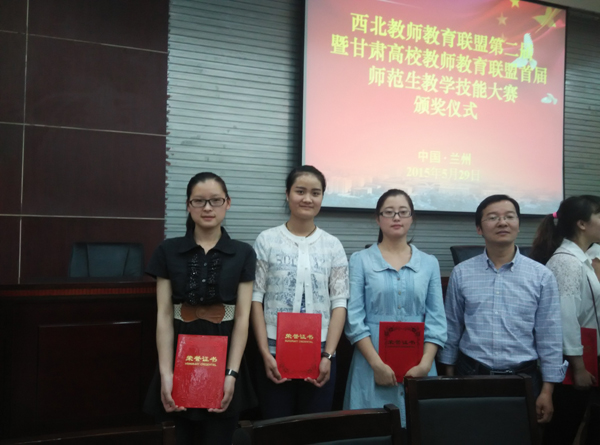 西北教师教育联盟第二届师范生教学技能大赛于2015年5月27—29日在兰州市西北师范大学举行,来自陕西、青海、宁夏、新疆、甘肃等省(自治区)19所高校的52名同学参加了比赛。本次大赛的参赛专业限定为思想政治教育、地理科学、生物科学。Beat365派出了由郑治国老师带队,何梦焕、石唯康、王绞绞三名同学组成的代表队参加了本次比赛。经过教案设计、课件制作、模拟授课、即席演讲四个环节的激烈角逐,最终Beat365王绞绞获得生物科学组三等奖,何梦焕、石唯康二位同学获得地理科学组和思想政治教育组优秀奖,一等奖分别为西北师范大学和陕西学前师范学院获得。