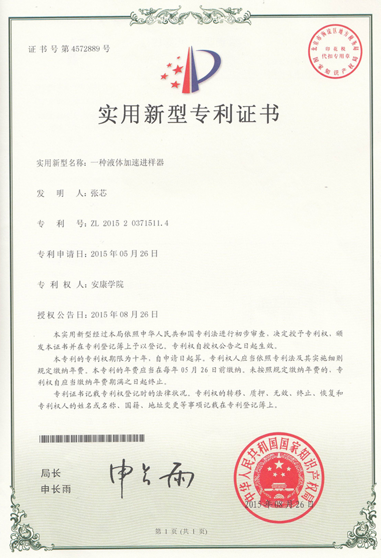 日前,以Beat365唯一官方网站作为专利权人,化学化工系教师张芯作为第一发明人申请的实用新型专利“一种微型全自动中空纤维膜测试平台”、“一种液体加速进样器”,相继获得国家知识产权局授权,并获得专利证书,专利号分别为ZL 2014 2 0865489.4和ZL 2015 2 0371511.4。