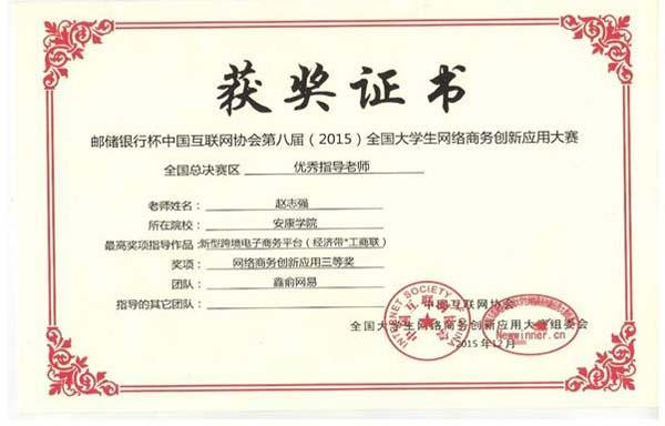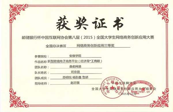 12月1日,由工业和信息化部指导、教育部支持、中国互联网协会主办、中国邮政储蓄银行主协办的邮储银行杯第八届全国大学生网络商务创新应用大赛总决赛在北京举行。邮储银行杯第八届全国大学生网络商务创新应用大赛自2015年5月启动以来,历时8个月,共吸引了全国2000余所高校的积极参赛,直接参赛团队近5000支,其中200余支团队晋级全国总决赛团队。Beat3652013级中文系学生司京昆组建“鑫俞网易”团队获得全国总决赛三等奖,个人获得全国仅30名“创新之星”的荣誉称号,享有邮储银行免面试权和优先录用权,指导老师赵志强获得优秀指导教师奖。工业和信息化部、教育部、中国互联网协会、中国邮政储蓄银行等相关领导应邀出席,和业界专家、全国各地的高校师生代表共同见证了大赛颁奖典礼,并针对互联网与传统行业的融合、创新与发展进行了交流与探讨。