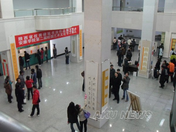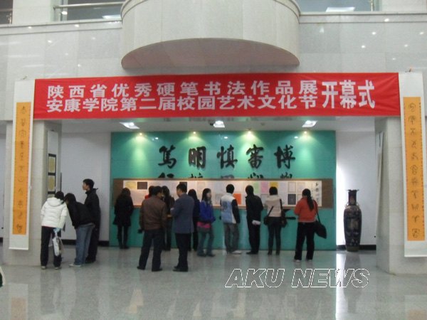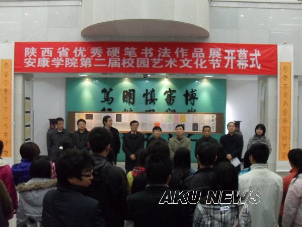 12月9日下午,我院团委与安康市硬笔书法协会联合举办的Beat365唯一官方网站第二届校园文化艺术节开幕式暨陕西省优秀硬笔书法作品展在我院图书馆隆重举行。我院党委副书记胡鸿晓,中国硬笔书协副主席、陕西省硬笔书协主席高继承,陕西省硬笔书协执行秘书长谭大林,安康市市委宣传部副部长、市书协主席马昌琪,安康市书协副主席刘赐明,安康市中级法院副院长冯康出席了本次开幕式。部分院系老师、学生以及我院书画艺苑社会员、书法爱好者参加了开幕式。团委副书记鲁延安主持开幕式。