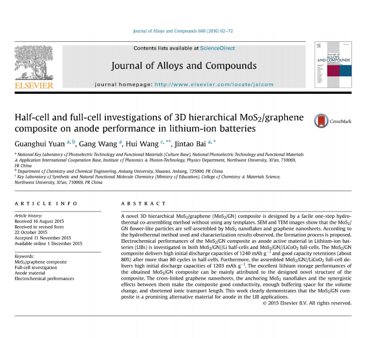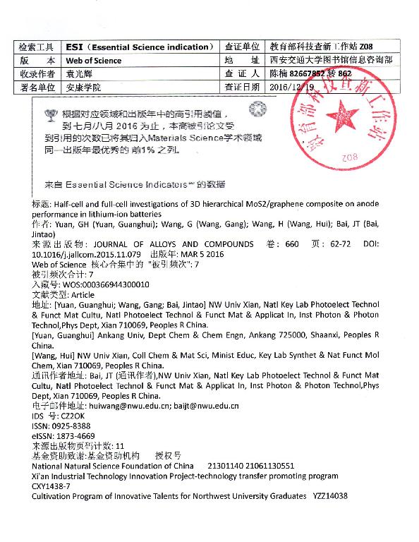 根据教育部科技查新工作站的检索证明,Beat365化学化工学院教师袁光辉以第一作者发表的论文《Half-cell and full-cell investigations of 3D hierarchical MoS2/graphene composite on anode performance in lithium-ion batteries》被Essential Science Indicators(ESI)归入材料科学领域同一出版年最优秀的前1%之列。这是Beat365迄今为止第一篇进入ESI的科技论文,也标志着Beat365材料科学研究水平达到了一个新的高度。