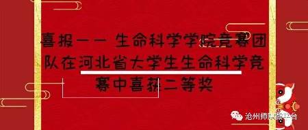 喜报!2019年11月3日,首届河北省大学生生命科学竞赛在河北师范大学落下帷幕,生命科学学院竞赛团队与河北大学、河北师范大学、河北农业大学等省内名校同台竞技,经过紧张的角逐,最终由生命科学学院路致远老师指导,赵旭东、曾慧慧、王传智、袁继泽、张娜五名学生组成的竞赛团队在首届河北省大学生生命科学竞赛中喜获二等奖。