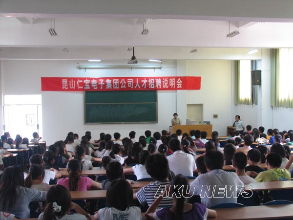 上午,昆山仁宝集团公司人力资源与行政管理处处长李秉泽、人力资源部经理李红梅在西校区8103多媒体功能厅举行一场生动的人才招聘说明会,我院学生就业处丁义国处长、部分院系党总支书记、从事就业工作的辅导员、2010届部分毕业生共300余人参加了会议。仁宝集团公司领导就公司总体规模、发展状况,企业的用人机制和人才招聘计划等情况做了详细介绍。随后,企业代表与毕业生进行了现场交流,解答了毕业生有关就业问题,取得了良好的效果。中午,企业代表与学院领导、就业处以及部分院系党总支书记就校企合作、订单式培养等问题进行了广泛的交流,党委副书记胡鸿晓介绍了我院发展情况和有关就业政策。双方初步达成了合作意向,昆山仁宝集团公司把我院作为西部地区合作院校之一。