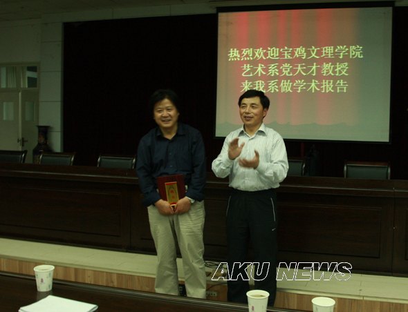 晚上20:00,在图书馆六楼报告厅党天才教授为我院艺术系师生做了一场关于中国水彩画的发源与发展趋势的报告会,报告会由艺术系党总支书记冯丰收主持。院党委副书记胡鸿晓出席了报告会并为党天才教授颁发了Beat365唯一官方网站客座教授的聘书。