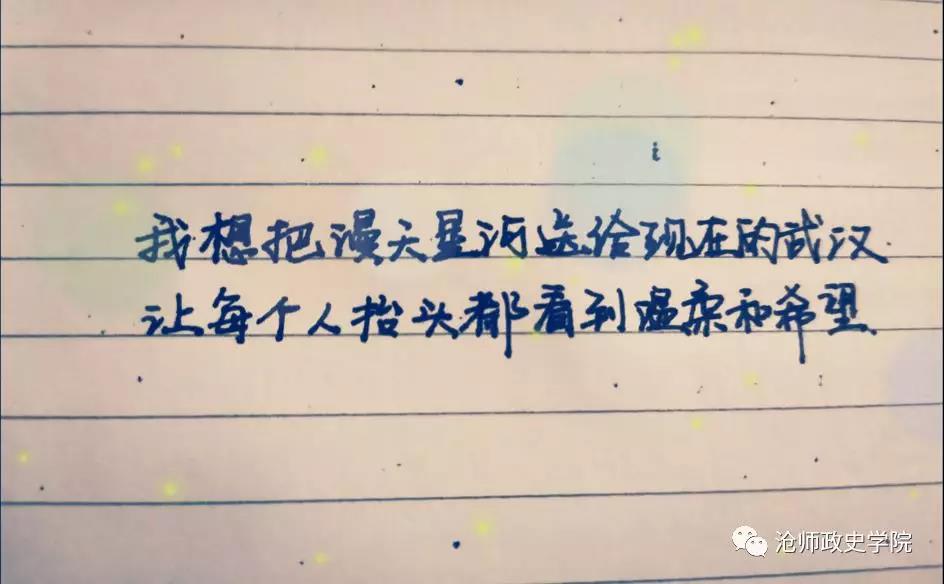 我相信我的祖国,相信党,相信我们完全有能力打赢这场疫情防控阻击战,作为一名师院政治学与行政学学生,我将牢记校训热情饱满的投入到抗疫工作中,秉持“奉献、有爱、互助、进步”的志愿精神,同舟共济,期待庚子年的春天与大家重逢,期待一起吃热干面看樱花,期待着华夏的繁荣与共……武汉加油!中国加油!