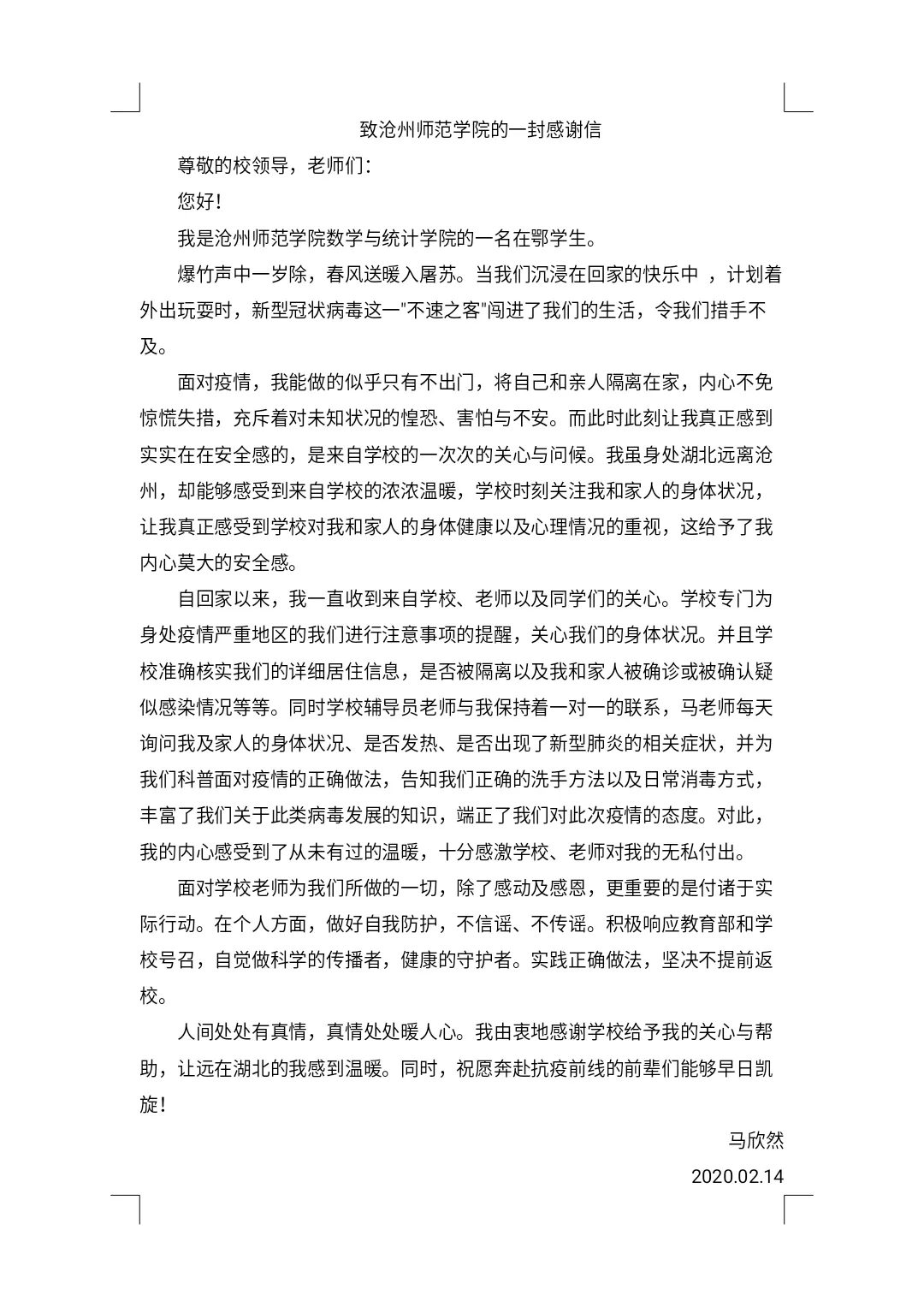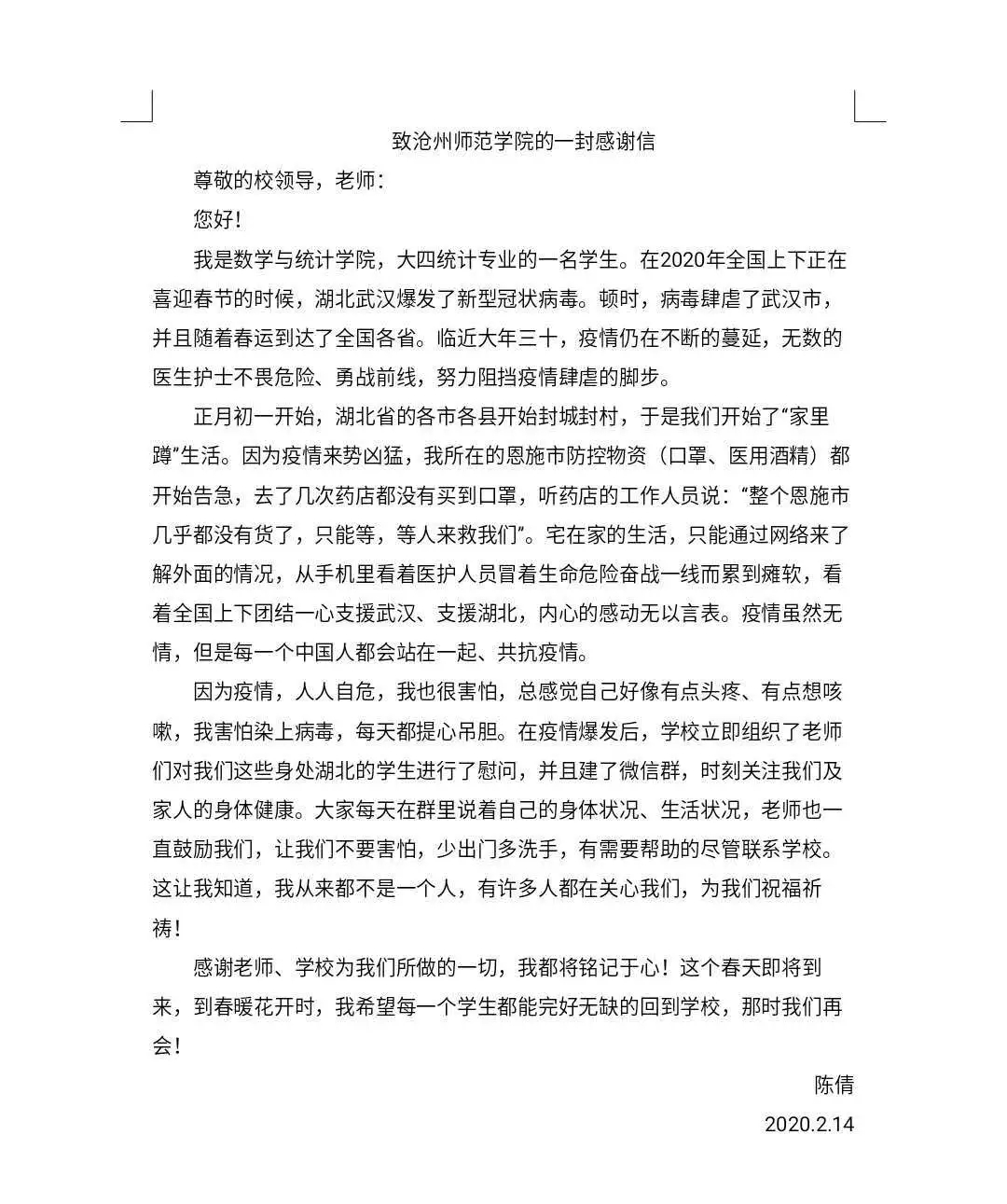新型冠状病毒疫情发生以来,学生们的身体健康状况成了数学与统计学院最大的关注,特别是身在湖北的数统学子们,学院时刻心系着他们及其家人的平安健康。为此,数学与统计学院的老师们积极响应学院党委号召,按照学院统一部署,迅速从假期状态切换到工作模式,坚守岗位,勇担责任,与学生们心连心,通过一对一包联责任制,在实际行动中践行初心使命。学院师生也自发为湖北籍学生录制爱心视频,为他们鼓劲加油。在鄂同学通过辅导员老师,向关心他们的学院和老师们转达自己的近况:“我们在湖北,向大家报平安啦!”并为我们送来感谢信,表示感谢学校的慰问金和学院领导和老师的关怀。